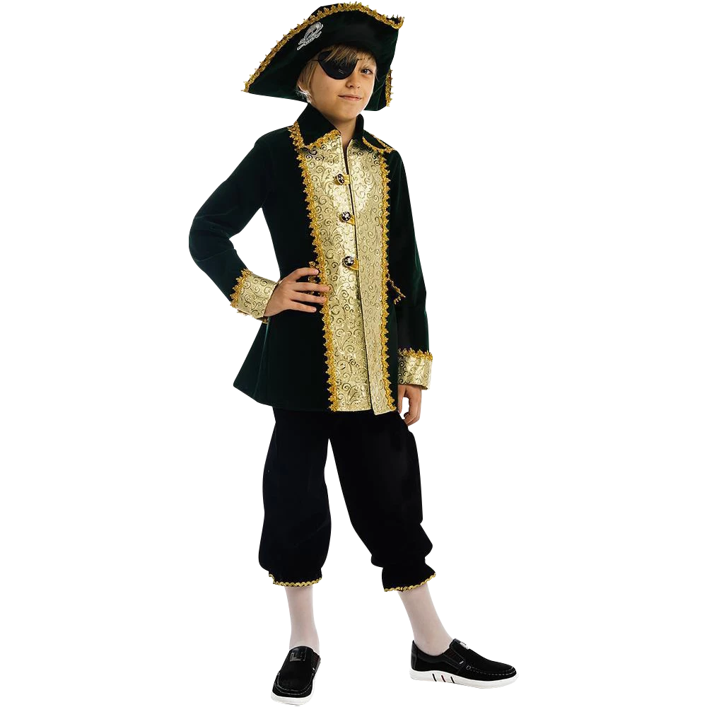 Includes eye-catching black jacket and pants with matching hat and eye patch to complete the pirate look. All other accessories sold separately.
