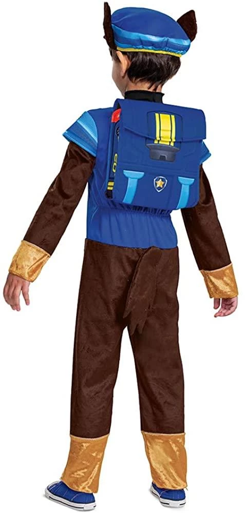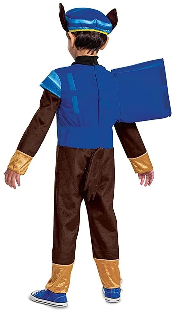 DELUXE PAW PATROL CHASE COSTUME SET – Includes a hat with ears as well as a full jumpsuit with a blue police top, detachable tail and vinyl chase badge