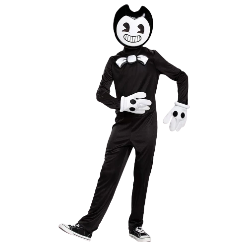 Officially licensed product | Product includes jumpsuit, pair of gloves, and character mask. | Black polyester jumpsuit with white satin bowtie detail | Breathable and adjustable bendy half-mask with comfort foam for wearability.