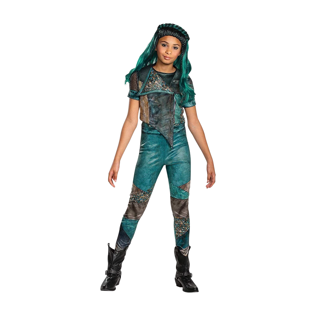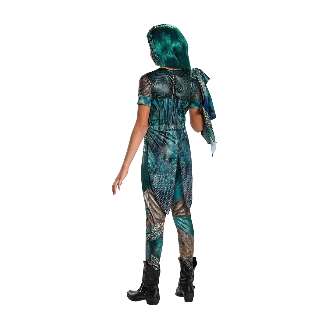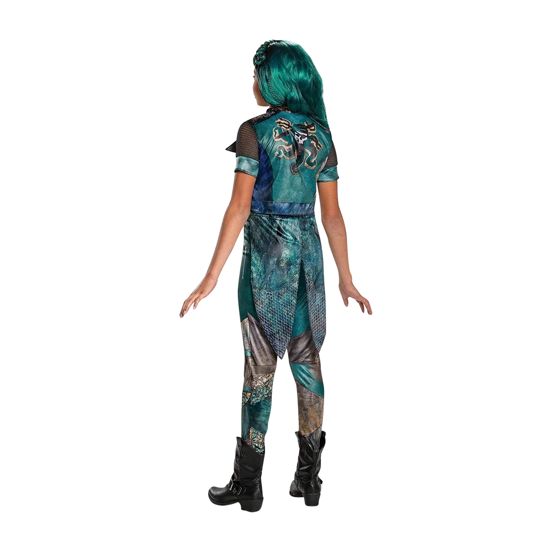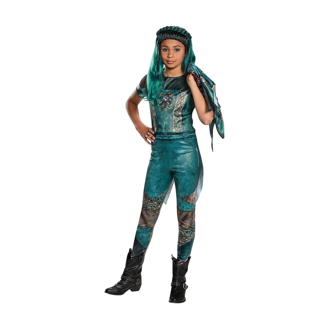 From the hit movie series Descendants comes this Descendants 3 Deluxe Costume for kids! Your fashionista can look like the most popular Disney character with the matching wig. Choose the character from the Descendants 3 kit to wear for Halloween, birthday parties, etc. Your youngster will enchant the crowd without even casting a spell when she’s dressed in this officially licensed Mal Costume for girls from Disney’s Descendants 3! Command the seas in this ocean-inspired Uma look. The jumpsuit is fully printed with a collar.