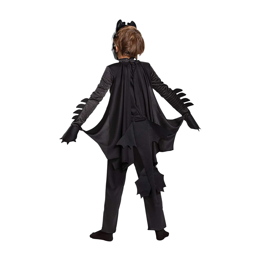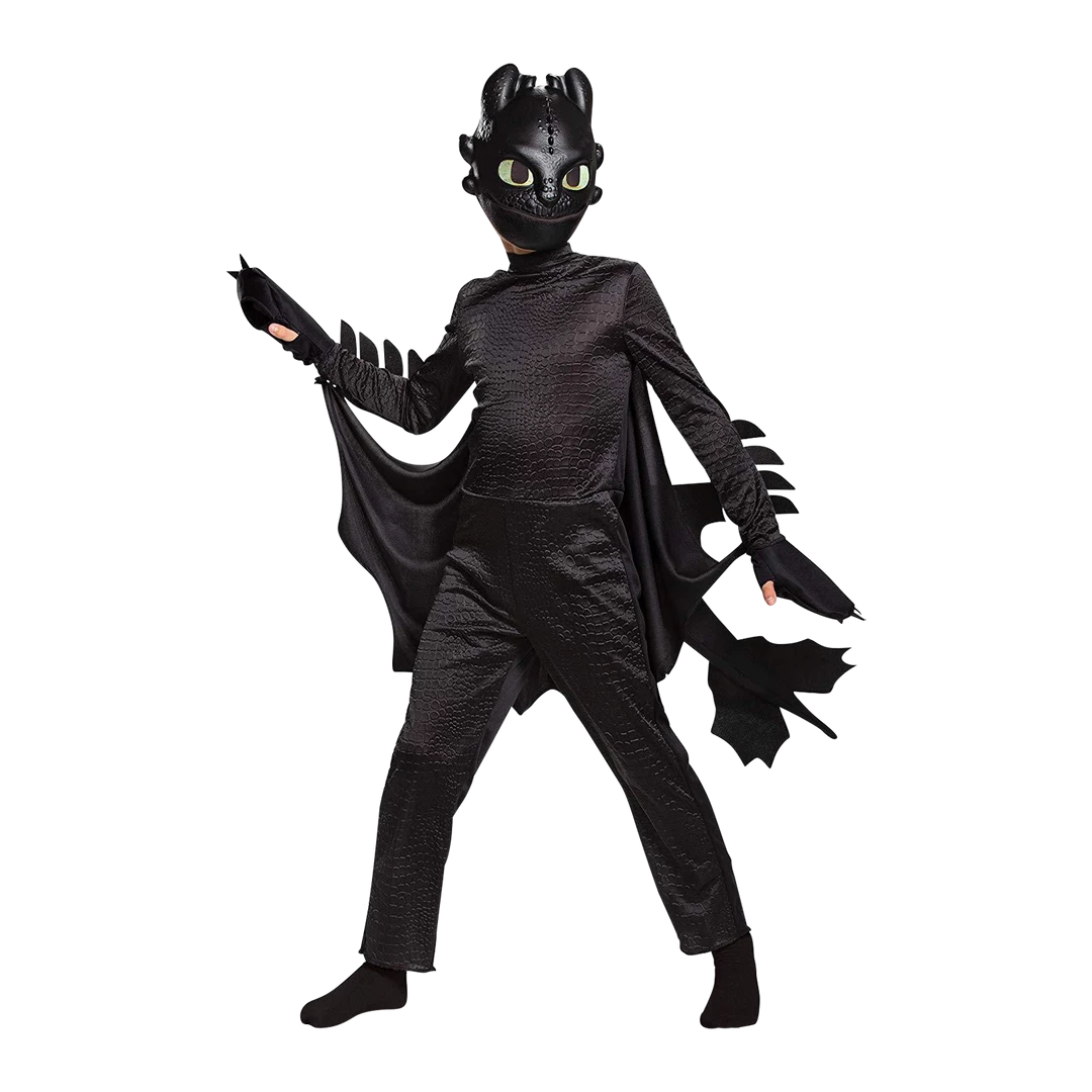 From the popular movie How to Train Your Dragon The Hidden World! Your little angel will be soaring through the sky this Halloween when you pick up the Toddler Deluxe Toothless Costume. If you’re looking for the perfect How To Train Your Dragon costume for your child this year, then don’t look any further than this one. Complete with a black Toothless jumpsuit with a detachable pair of wings and a tail, a pair of matching gloves, and a fun Toothless mask, you can’t go wrong with this special get-up. Buy yours today, and then team up with Hiccup, Astrid, and Light Fury for a night fit for loads of fun and fire-breathing! Jumpsuit with attached wings detachable tail and mask. Fits children sizes 7-8.
