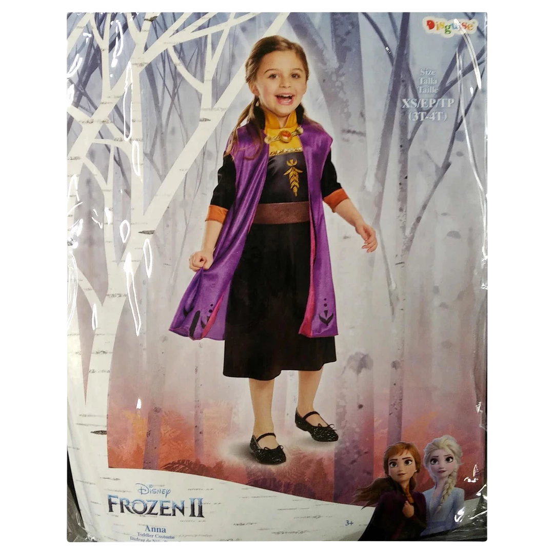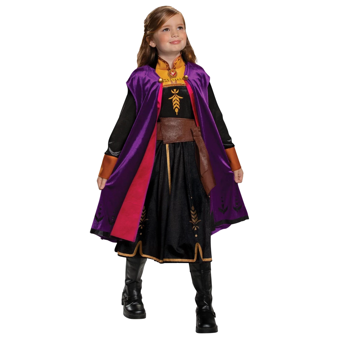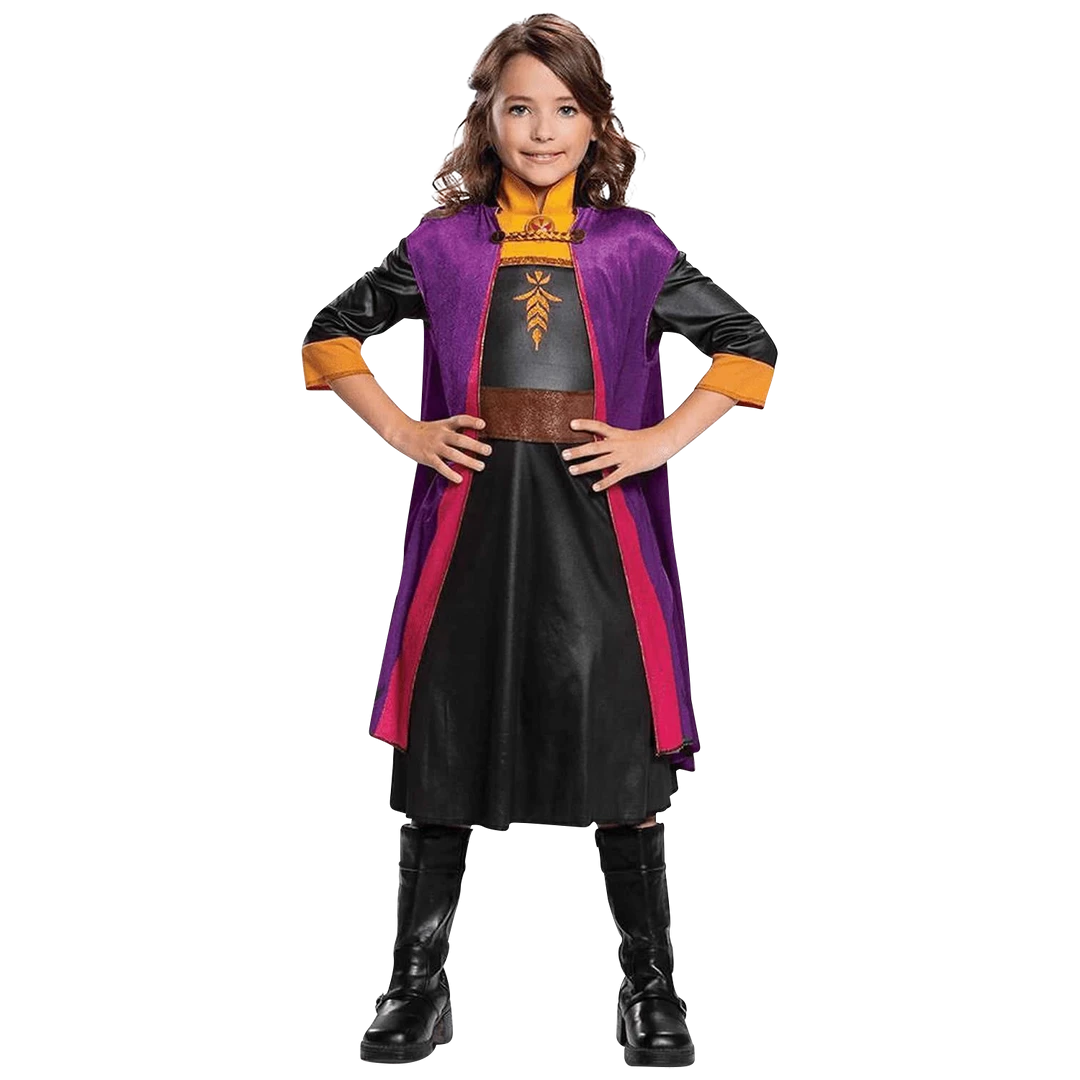 Become your favorite loveable character from frozen in this Anna deluxe costume. The tea-length dress and Cape both feature a glitter print. Bodice includes a sculpted detail at the neckline. Cape has a braided trim closure detail.Â
