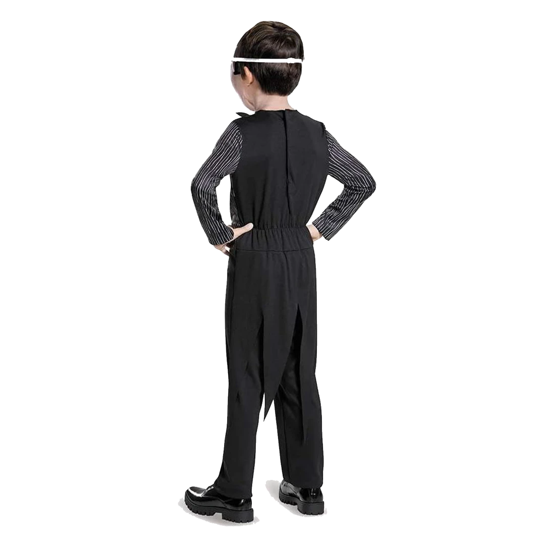 Get ready to rule over Halloween Town in our Jack Skellington Classic Child costume. Jumpsuit features a pinstripe suit top with attached coat tails, detachable bat bow, and character half mask. This classic costume is cute, comfortable, and easy to wear. It has it all! Share your love for the Night Before Christmas with your little one this Halloween in our awesome Jack Skellington costume for boys!
