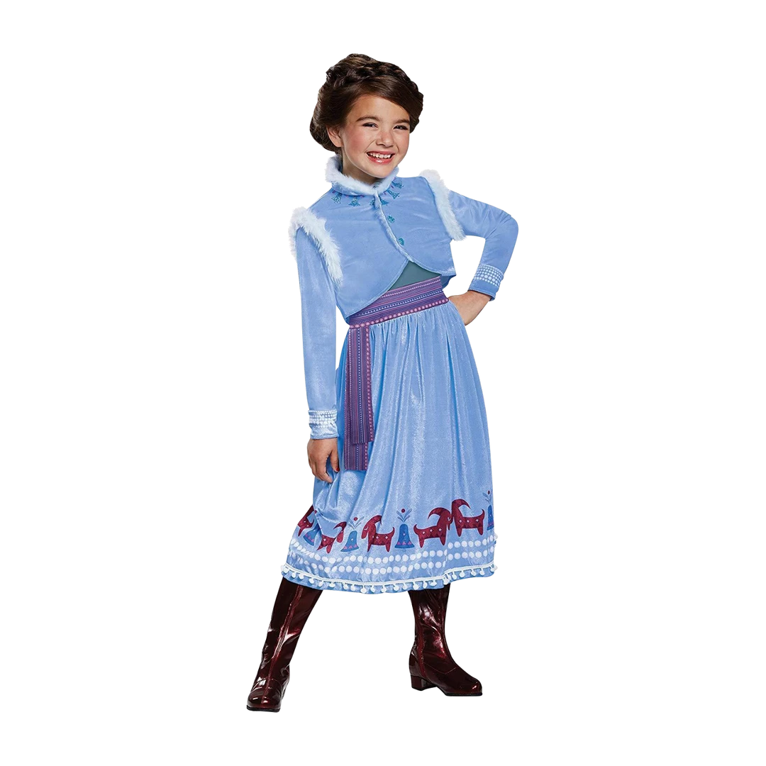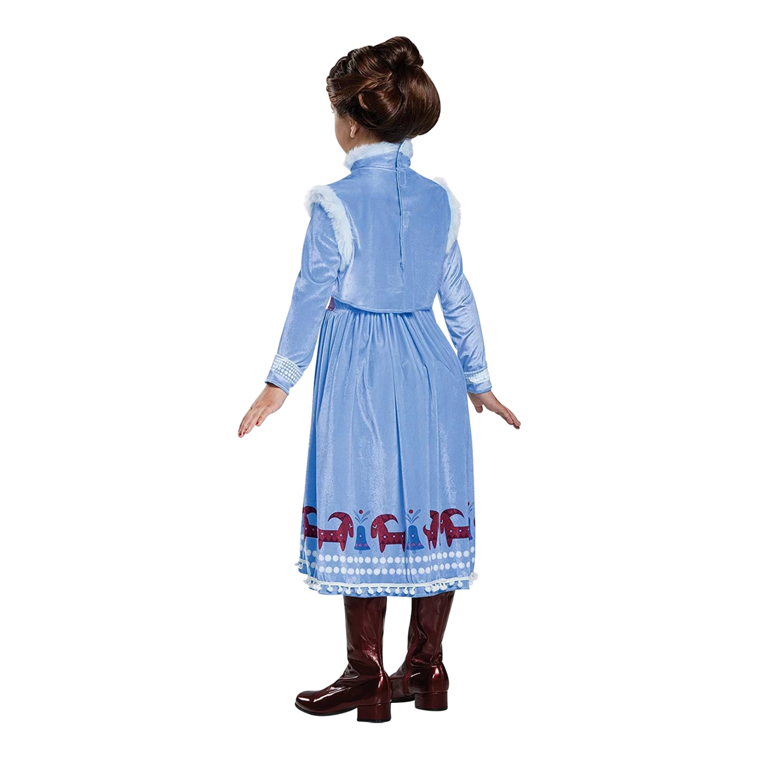 Olaf and Sven embark on a mission throughout Arendelle to help Anna and Elsa find the best family tradition ever and now girls can wear her new dress in this beautiful costume with adorable print on the bottom of the dress and includes a separate jacket.