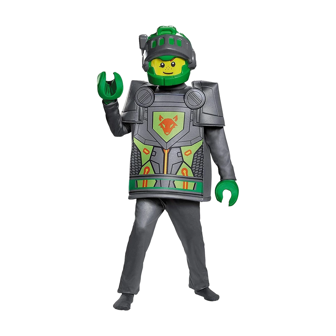To get a look any more realistic than this Prestige Nexo Knights Aaron Boys Costume, he’d have to build it himself out of LEGO bricks! But it’d be hard to move if for sure. – Shirt – Pair of Shoulder Pieces – Pants – Mask – Pair of Gloves