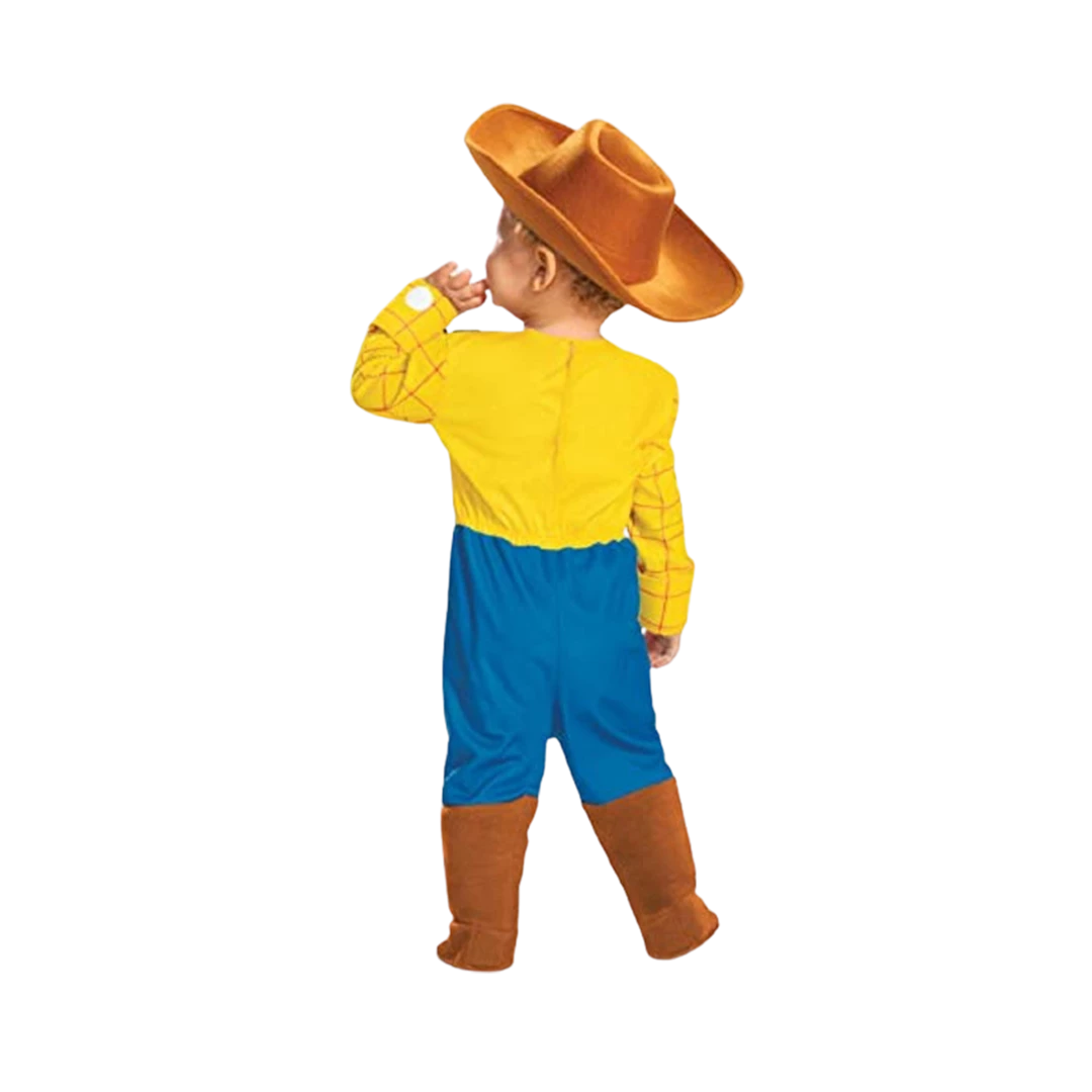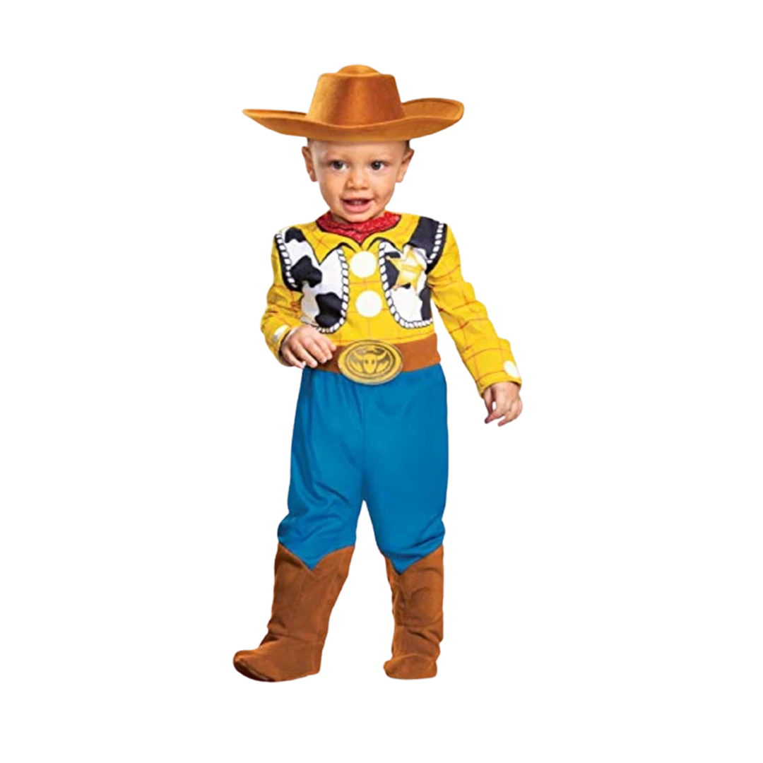 Put your little tot in this Deluxe Woody Baby Costume and he can have amazing adventures with all his toy pals like in the much-loved Toy Story movies. This baby costume includes a deluxe cowboy-style footed jumpsuit with printed details and brown cowboy hat. Velcro closures at the top and snap closures on the legs allow for quick diaper changes so your little cowboy can get back to being the sheriff and save any toys in need!