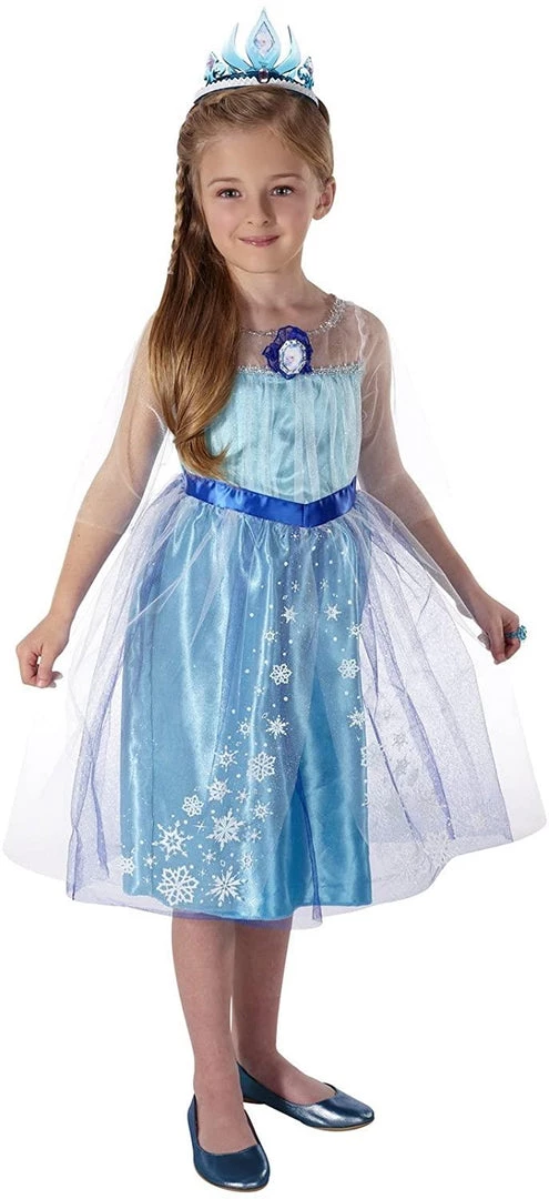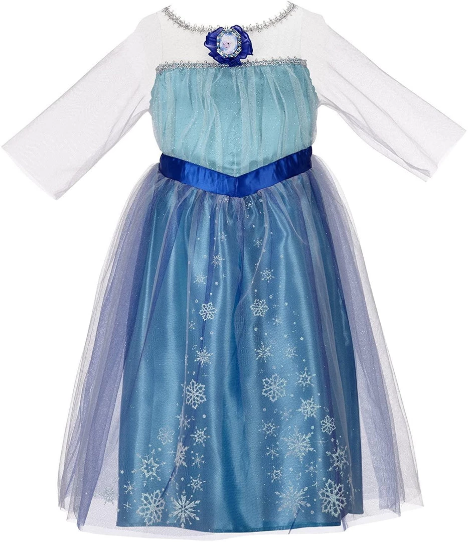 Elsa costume has a multi layer skirt with glittery snowflakes | The dress’s bodice is decorated with a beautiful glitter design | Cameo of Elsa | For ages 3 plus, size 4-6X