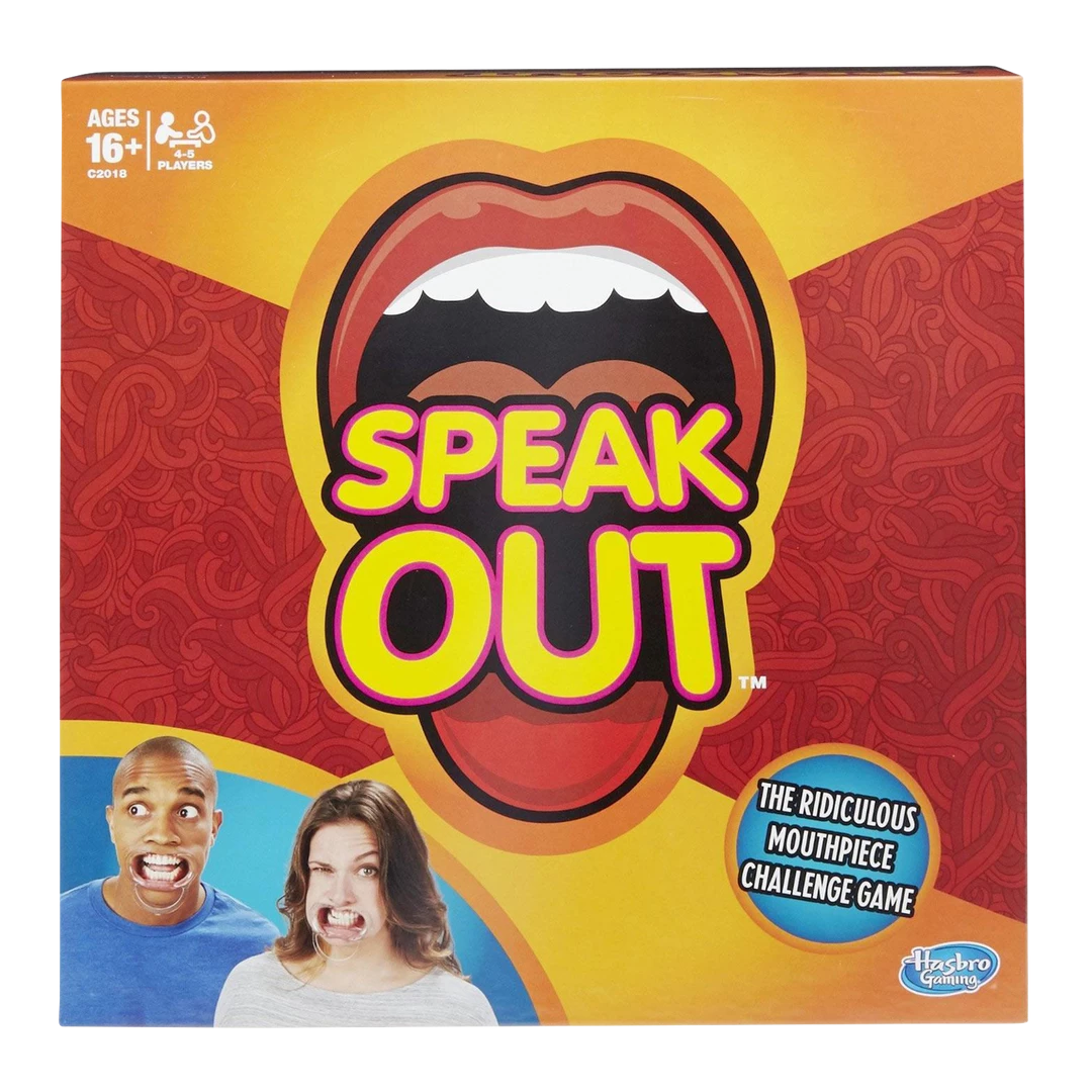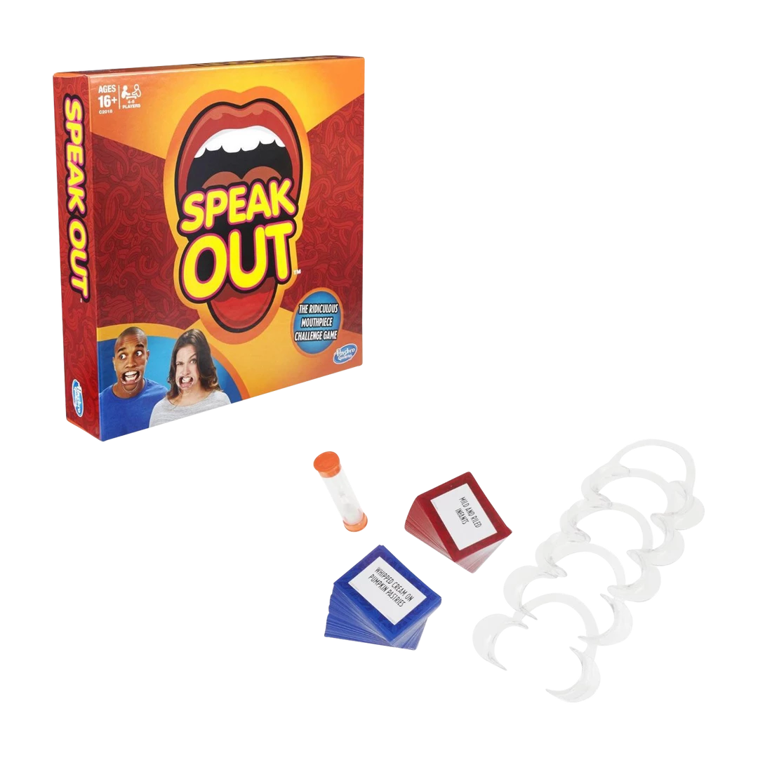 The Speak Out game brings friends and family together for laugh-out-loud fun as players try to say different phrases while wearing a mouthpiece that won’t let them shut their mouth.