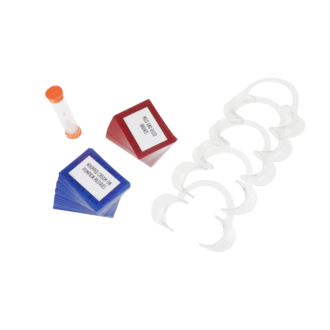 Includes 5 mouthpieces, 200 double-sided cards, timer, and instructions