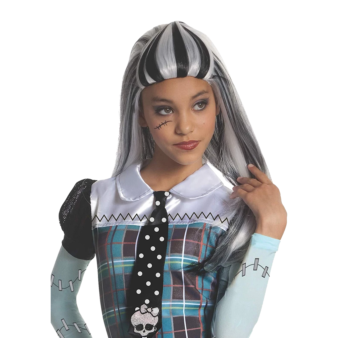 Great accessory for your Monster High Frankie Stein costume! Wig is Frankie’s classic style with black and white streaks. Hair is pulled back in front with a mesh cap underneath for a secure fit. One size fits most children. 100% synthetic fibers. Rubie’s has licensed costumes and accessories that make dress-up fun for children and adults.
