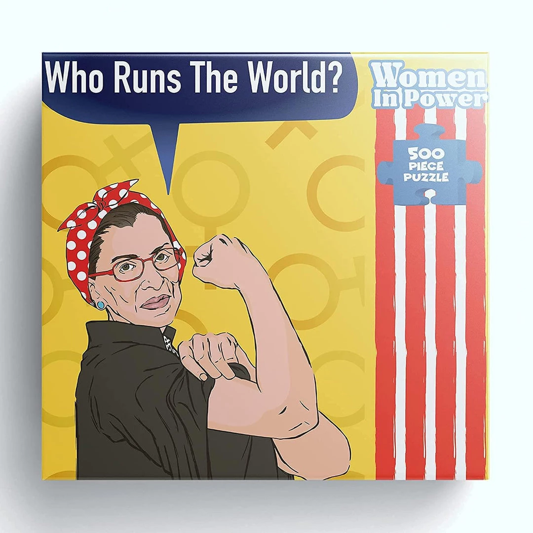 WOMEN IN POWER: This Rosie The Riveter-inspired jigsaw puzzle celebrates the late, great Ruth Bader Ginsberg, the “Notorious RBG,” a groundbreaking and influential political pioneer unmatched by any other in US history!