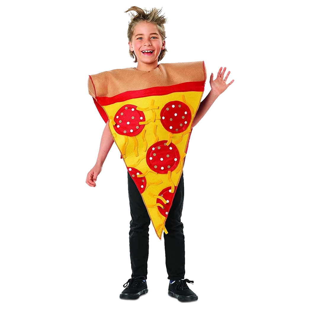 This pizza slice costume is everything a child needs to look the part. Perfect for use as a theater, pizzeria costume, dress-up outfit, or Halloween costume.