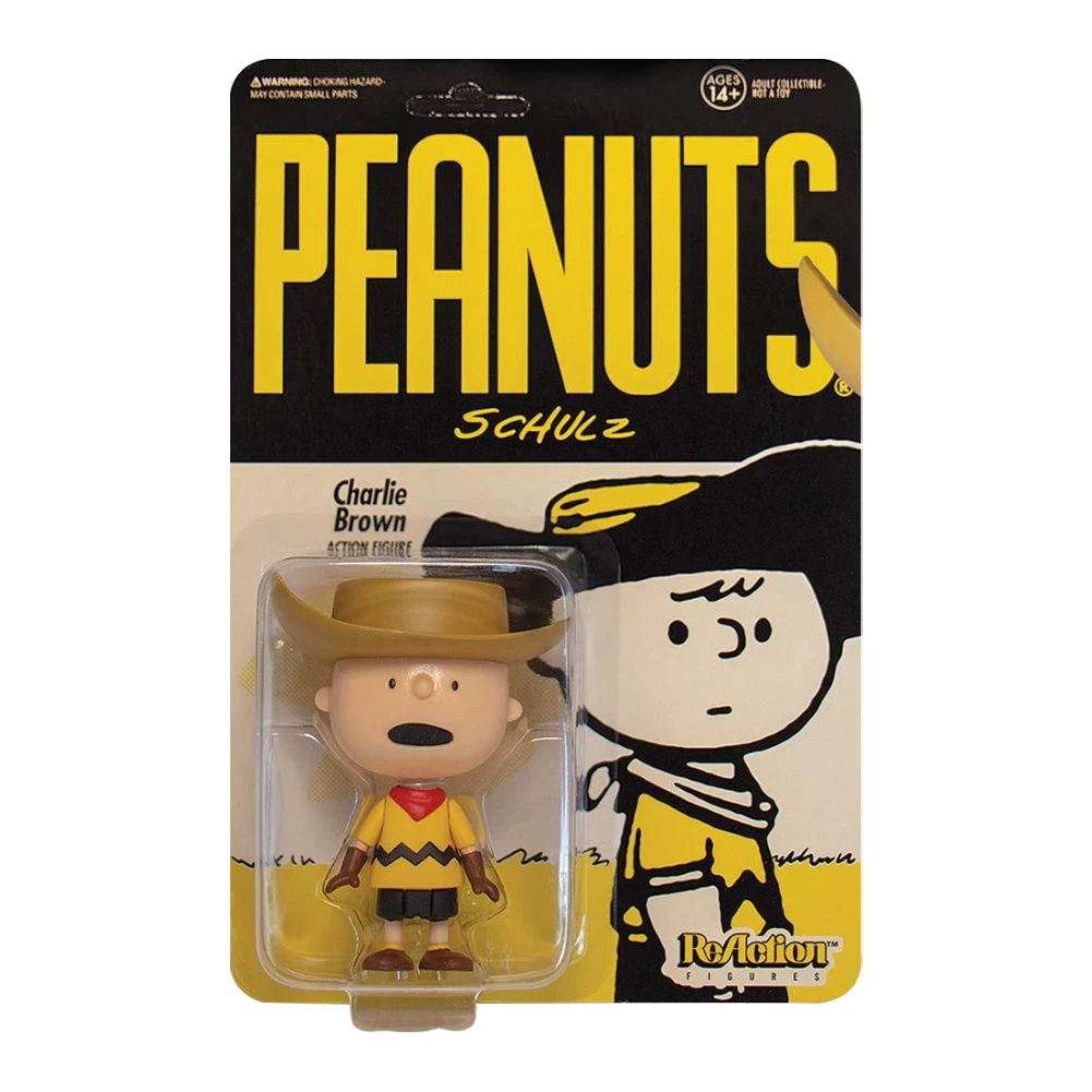 Take a trip back in time with the Peanuts Cowboy Charlie Brown 3 3/4-Inch ReAction Figure! Packaged on a special retro card back featuring Charles Schultz artwork and limited coloring, this articulated plastic nostalgia piece is sure to look great on your desk or near your favorite childhood toys.
