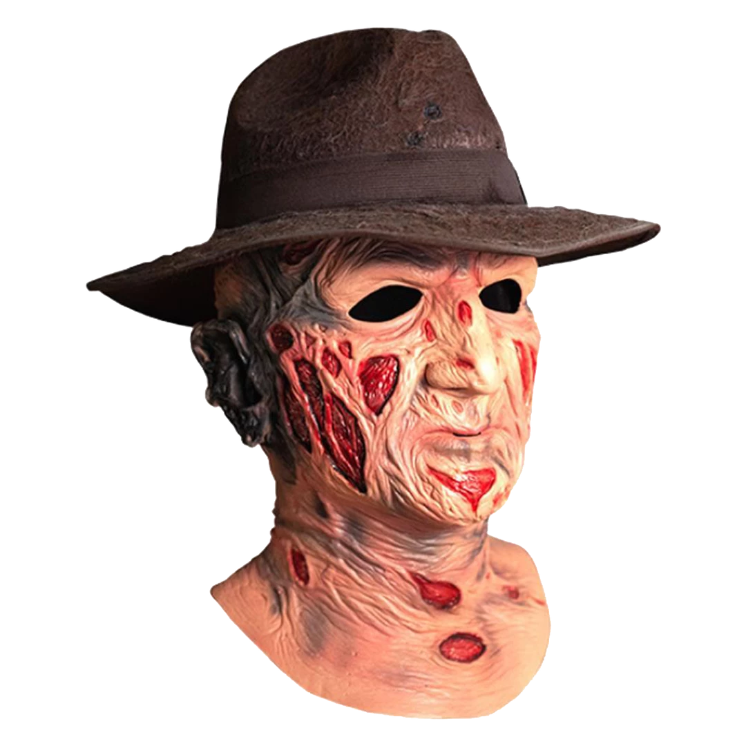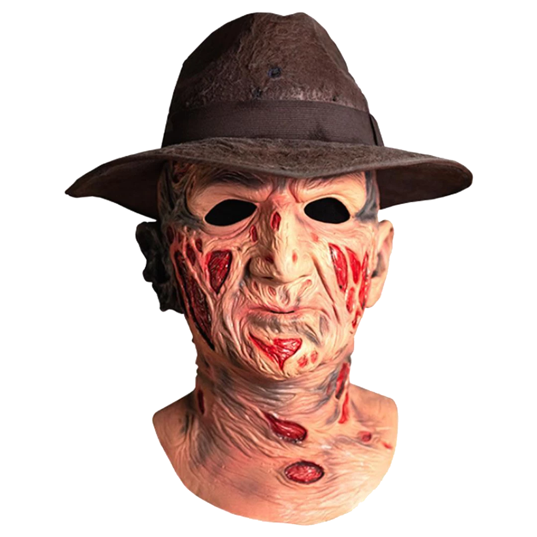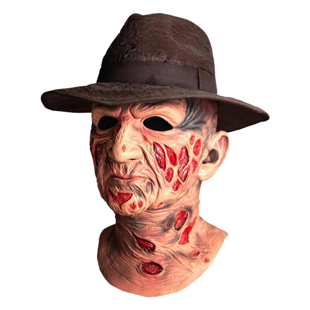 Trick or Treat Studios and Warner Bros. Pictures are proud to present the officially licensed A Nightmare on Elm Street Deluxe Freddy Mask with Fedora Hat. Based on hundreds of screen and behind-the-scenes photographs, this is the ultimate Freddy Krueger Mask from Wes Craven’s original classic, A Nightmare on Elm Street. Every detail of Freddy, as played by the incredible Robert Englund is present in this mask. In addition to this incredible mask, this version of the mask comes with a beautiful replica of the Fedora Hat worn by Freddy Krueger in A Nightmare on Elm Street.