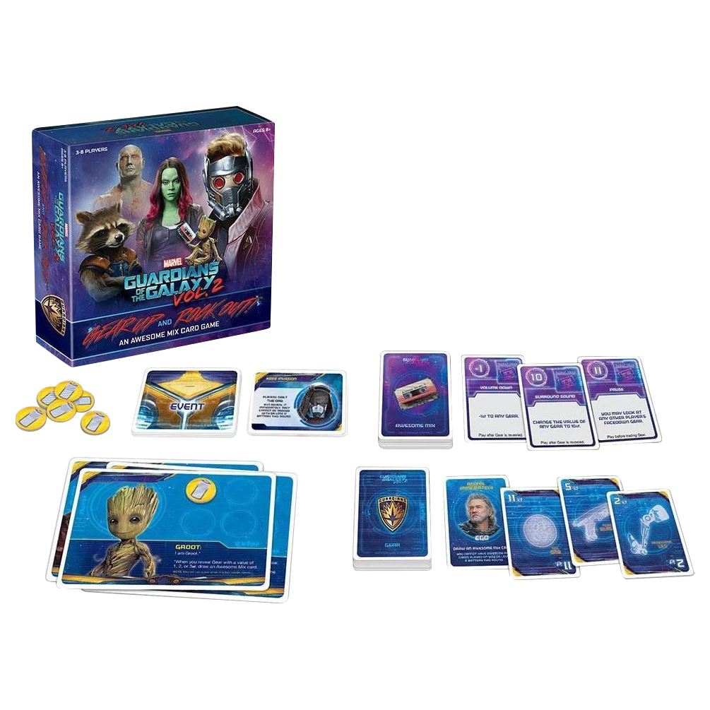 The Guardians of the Galaxy Vol. 2: Gear up and rock out! an awesome mix card game offers an all-new gameplay with your favorite ragtag team from the hit movie franchise. Do you have what it takes to keep the music playing? Play as your favorite intergalactic hero as you do whatever it takes to avoid ending up with the worst gear. Custom event cards add a new twist to every round and all bets are off when the ego comes into play. Bluff, trade and steal your way to victory! Bluff, trade and steal your way to the ultimate Guardians of the galaxy victory